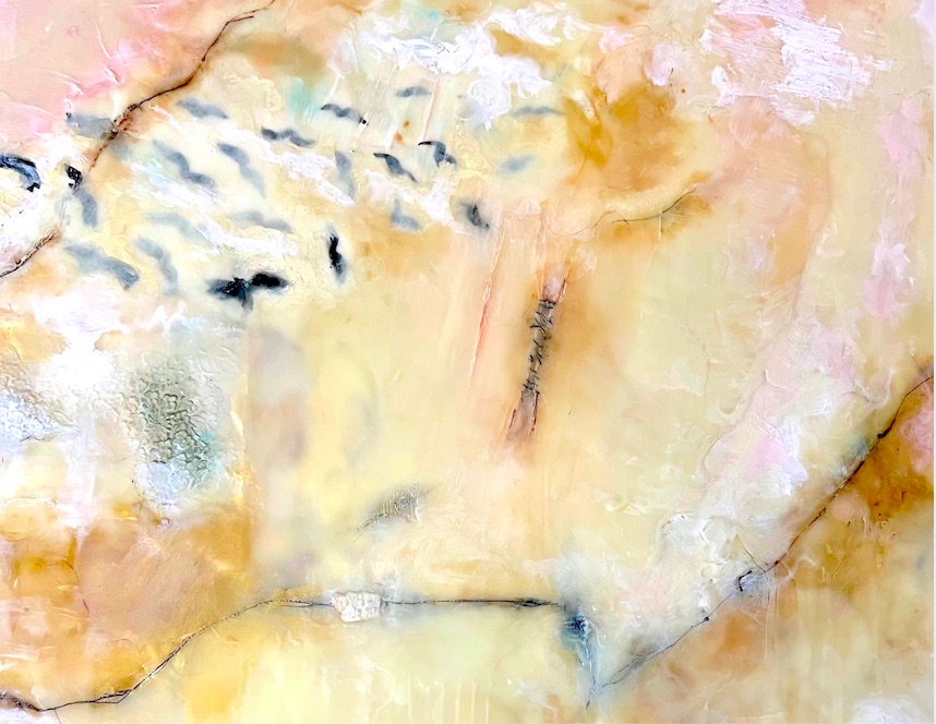 Mixed media on board. Encaustic, collage, oil sticks. 36’’ by 24’’ 2021