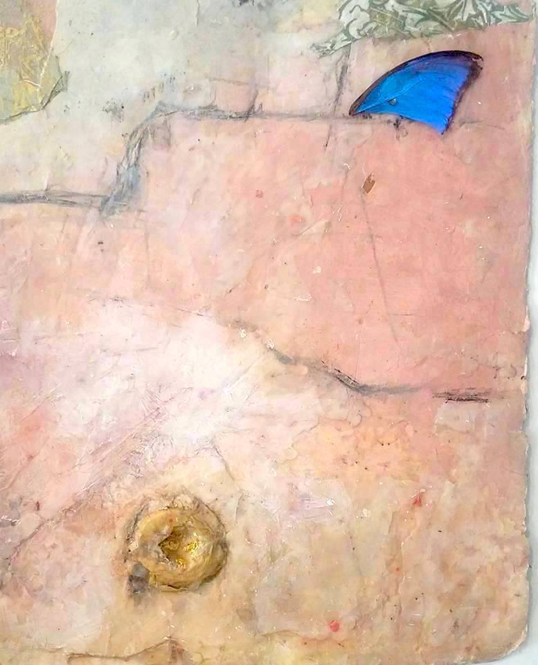 Mixed media on paper. Wax, charcoal, Tibetan handmade paper, pigments. 36” by 24” 2019